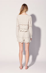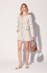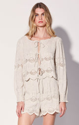 The Savanna Top is a long sleeve top in our beautiful embroidered fabric with scalloped hem. With open front tie detail and easy fit, it adds a little attitude to your every day look