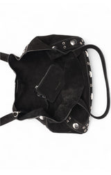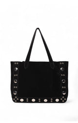 The Flynn Tote is your everyday on-the-go tote upgraded. Worn over the shoulder or carried by your side, this luxe suede style is detailed with grommets and studs along the sides for an edgy accent.