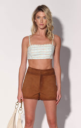 With a wide waistband and sleek fit, the Kendra Short is a minimalist must have. Coming in our treated suede in an eye catching color, pair is back to the Karla Top for an alluring 2 piece set