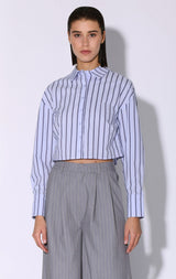 Collar button down front closure; Boxy crop fit; Long sleeves with buttoned cuff