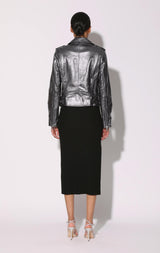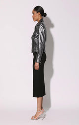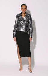 The Liz Jacket is a timeless leather moto we upgraded in metallic leather colors for a flashy must have addition to your night out look