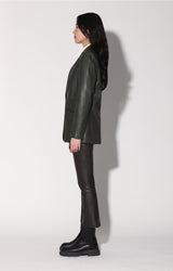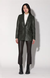 Leather; Notch collar, single center front button closure, slim long sleeves, top welt pocket and flap pockets at hip