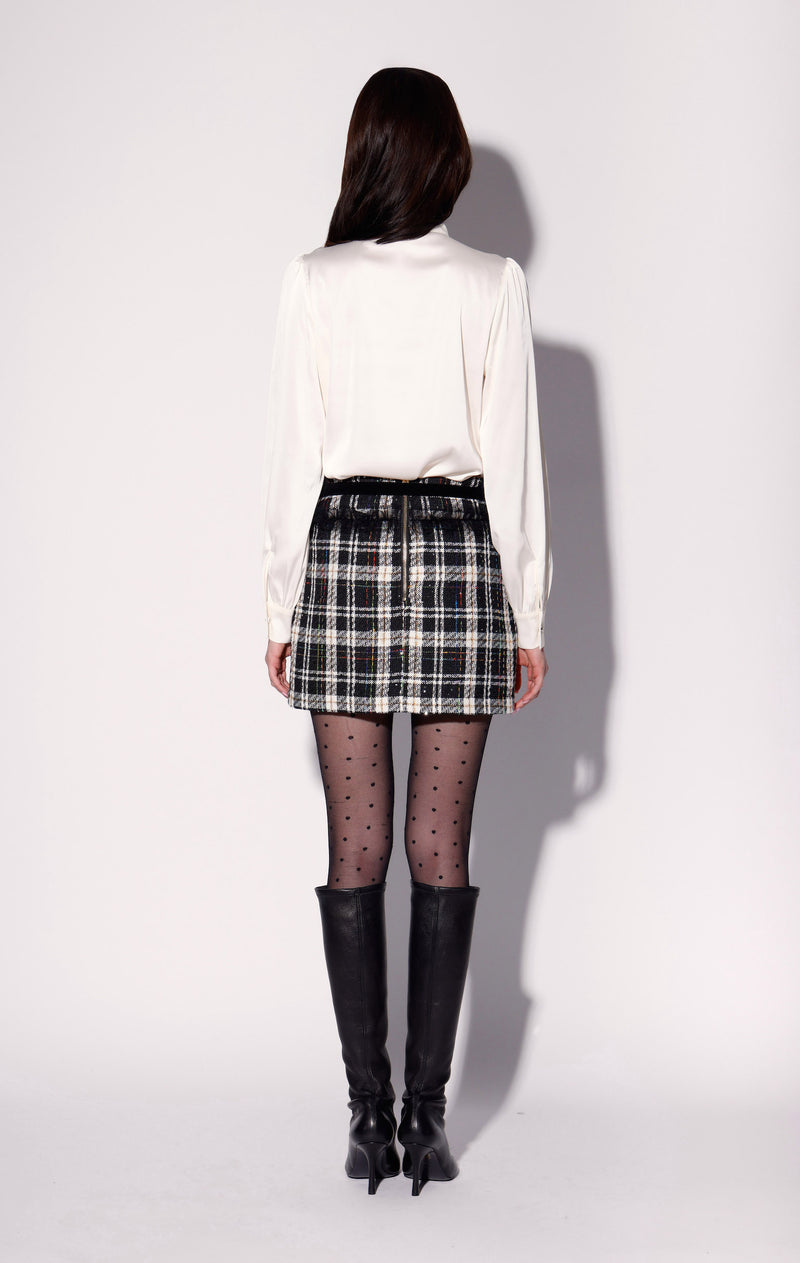 The Nelly Skirt a drop waist mini in our stylish plaid tweed fabric. With a chic velvet belt, tulle accents, and front pleat detail, it’s a flirty add to your closet, made even better with the matchign Nolita Jacket