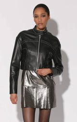 A cool cropped racer style, the Stevie Studded Jacket is elevated with raised stud embellishment. Finish any look with this jacket and get ready for some attention