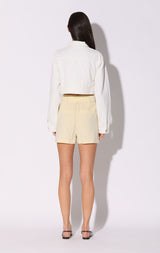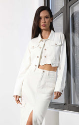 An edgy crop jacket in our white denim, the Tressa Jacket is the perfect addition to your closet. Wear it with the matching Selene skirt for a twist on the denim on denim look